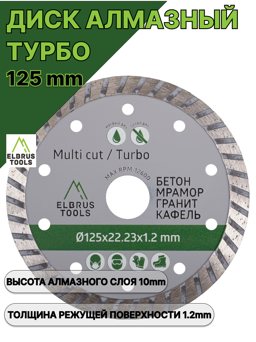 Диск алмазный ELBRUS TOOLS со специальным нанесением алмазной кромки изготовлен по технологии холодного прессования. Является незаменимым инструментом для профессионалов и любителей, работающих с такими твердыми материалами, как бетон, мрамор, гранит и кафель. Диск обеспечивает чистый рез, минимизируя риск сколов и трещин. Высококачественное концентрированное алмазное напыление отличает диск прочностью и долговечностью, что позволяет использовать его для обработки различных материалов. Диаметр диска для резки - 125мм и посадочное отверстие 22,23мм подойдет для большинства УШМ. Толщина режущей поверхности - 1,2мм. Ширина режущей кромки - 10мм. Предназначен для сухого и мокрого реза. Отрезной диск Эльбрус Тулз станет для вас отличным помощником при выполнении ремонтных и строительных работ. Пильные диски Эльбрус Тулс недорогие, но очень качественные и надежные. В нашем ассортименте вы найдете также чашки для зачитски (или шлифовальные чашки), сверла и биты. Спасибо, что выбираете нас!