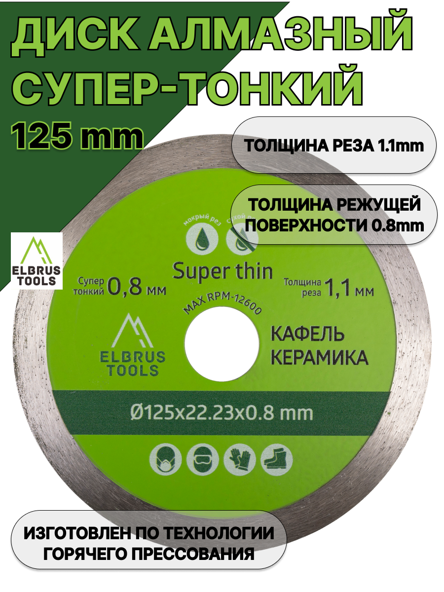 Диск алмазный ультратонкий ELBRUS TOOLS изготовлен по технологии горячего прессования и усилен фланцем. Является незаменимым инструментом для профессионалов и любителей, работающих с твердыми деликатными материалами. Благодаря своей ультратонкой конструкции, диск обеспечивает тонкий и чистый рез (1,1мм), минимизируя риск сколов и трещин. Высококачественное алмазное напыление отличает диск прочностью и долговечностью, что позволяет использовать его для обработки различных материалов, таких как керамика, кафель, мрамор и стекло. Диаметр диска 125мм и посадочное отверстие 22,23мм подойдет для большинства УШМ. Этот тонкий диск для резки идеален для выполнения деликатных работ, требующих высокой точности и аккуратности. Предназначен для сухого и мокрого реза. Отрезной диск Эльбрус Тулз станет для вас отличным помощником при выполнении ремонтных и строительных работ. Пильные диски Эльбрус Тулс недорогие, но очень качественные и надежные. В нашем ассортименте вы найдете также чашки для зачитски (или шлифовальные чашки), сверла и биты. Спасибо, что выбираете нас!