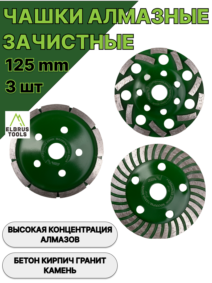 Набор алмазных зачистных чашек ELBRUS TOOLS, 125мм - незаменимый инструмент для профессионалов и любителей, работающих с твердыми материалами. Этот набор экономичен и очень удобен для ремонтных работ. Алмазные чашки предназначены для эффективной зачистки бетона, кирпича, искусственного и натурального камня, обеспечивая быстрый и качественный результат. Алмазное напыление придает высокую прочность чашкам и гарантирует долгий срок службы и устойчивость к износу. Турбированная рабочая поверхность одной из чашек усиливает качественную зачистку и варавнивание обрабатываемого материала. Диаметр чашек 125 мм (с посадочным отверстием 22,2мм) - универсален, подойдет практически к любой углошлифовальной машине и позволяет выполнять работы на участках различной площади. В набор входят три алмазные чашки: однорядная, двухрядная и двухрядная турбо.Зачистная чашка Эльбрус Тулз с вкраплением алмазов - ваш надежный помощник в строительстве, ремонте и отделочных работах. Благодарим Вас за выбор Эльбрус Тулс!