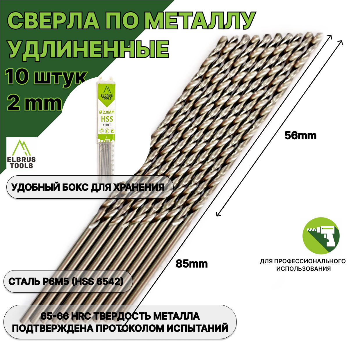 Общая длина сверла - 85мм, рабочая длина - 56мм. Сверло российского брэнда ELBRUS TOOLS предназначено для сверления в металле. Тип хвостовика - цилиндрический. Марка и твердость металла подтверждены протоколом испытаний российской специализированной лаборатории (№МЭХТ-08082023-1 от 08.08.2023 г.). Сверло по металлу изготовлено из быстрорежущей высококачественной стали марки 6542, что соответствует стандартам М2 и Р6М5. Твердость режущих кромок 65–66HRС, что является отличным показателем износостойкости сверла! Внешняя поверхность обработана полированием, что обеспечивает большую точность размера. Кончик сверла имеет двойную заточку, это позволяет засверливаться без предварительного кернения. Поставляется в удобной пластиковой коробке для хранения. Вы получаете прекрасный набор сверл, который компактно поместится в любое пространство, где хранятся инструменты.