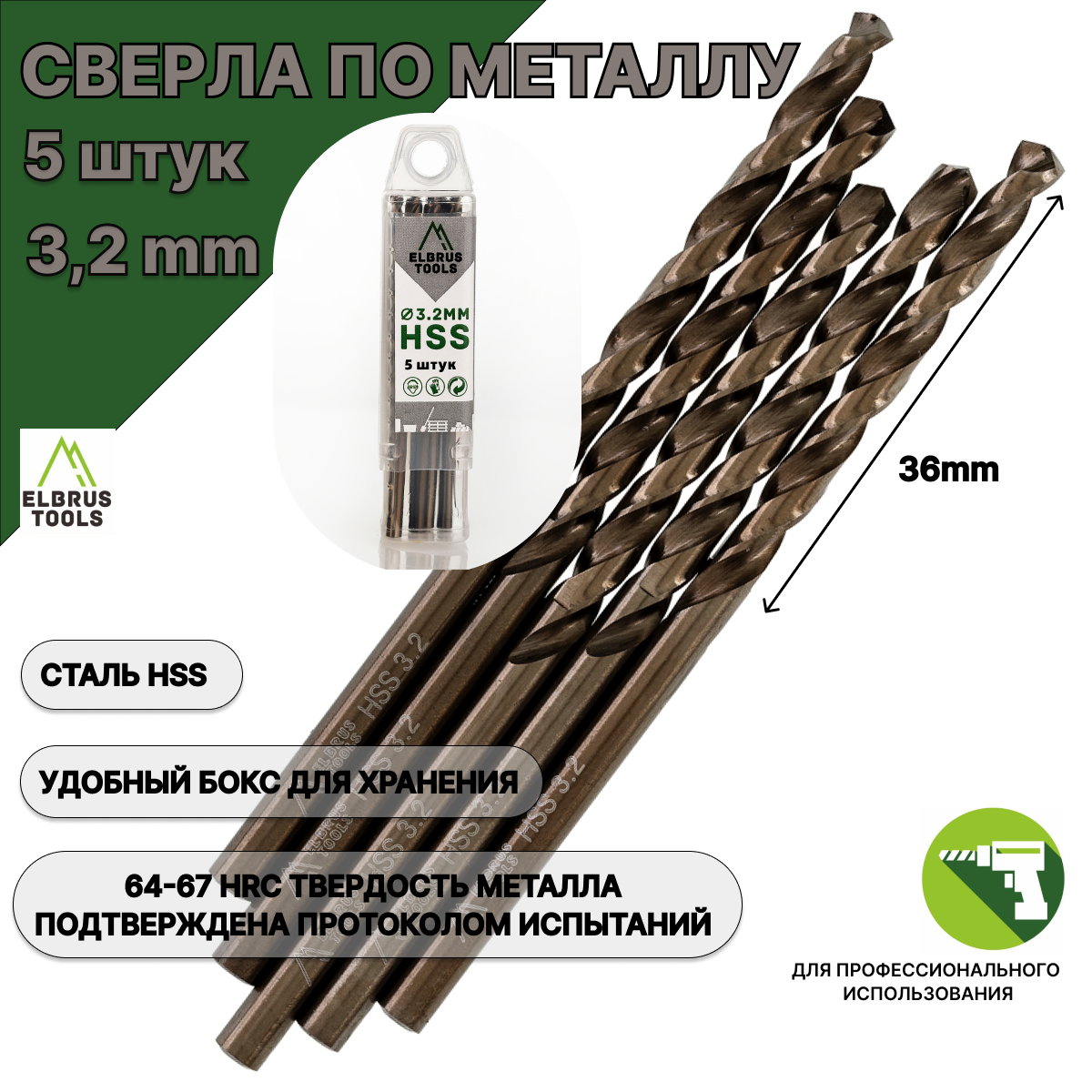 Общая длина сверла - 65мм, рабочая длина - 36мм. Сверло российского брэнда ELBRUS TOOLS предназначено для сверления в металле. Марка и твердость металла подтверждены протоколом испытаний российской специализированной лаборатории (№МЭХТ-12012024-1 от 12.01.2024 г.). Сверло по металлу изготовлено из быстрорежущей высококачественной стали HSS. Твердость режущих кромок 64–67 HRС, что является отличным показателем износостойкости сверла! Внешняя поверхность обработана полированием, что обеспечивает большую точность размера. Кончик сверла имеет двойную заточку, это позволяет засверливаться без предварительного кернения. Поставляется в удобной пластиковой коробке для хранения. Вы получаете прекрасный набор сверл, который компактно поместится в любое пространство, где хранятся инструменты. Тип хвостовика - цилиндрический. Подходит для нержавеющей стали и для профессионального пользования.